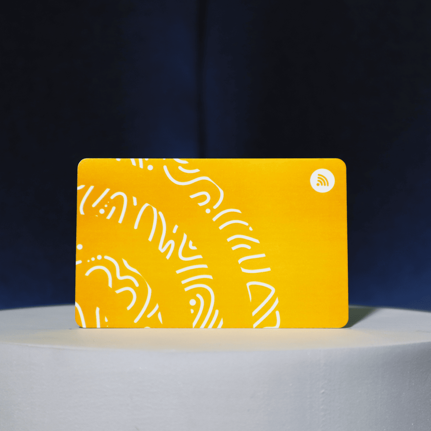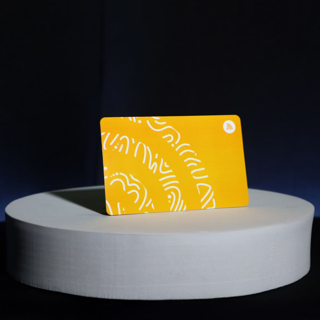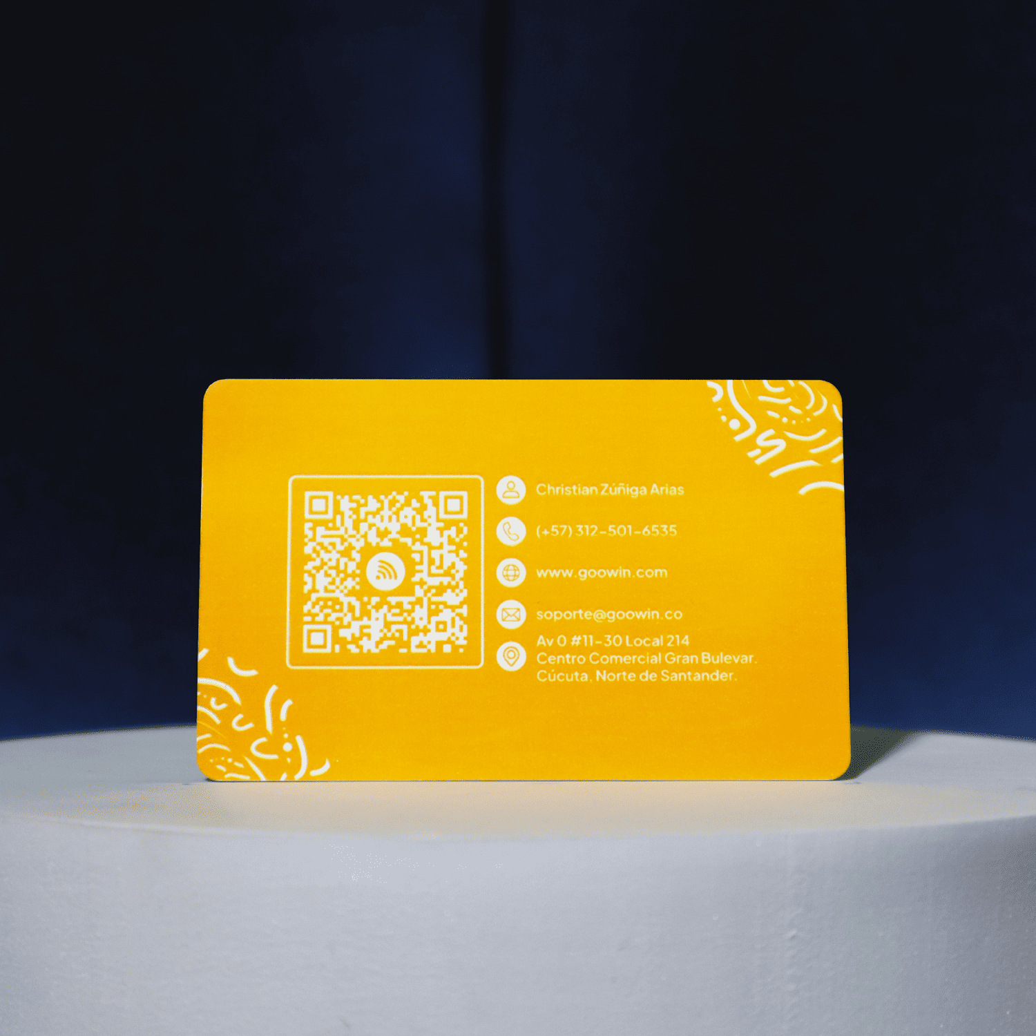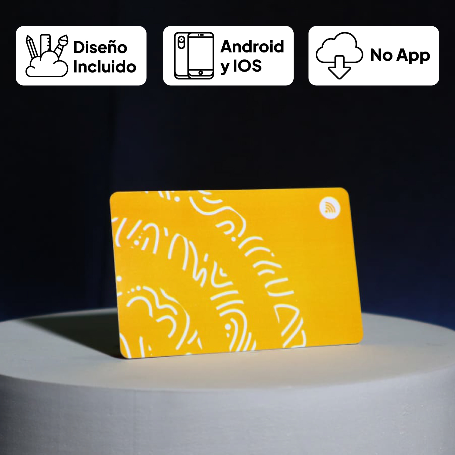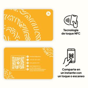 Tarjeta de presentación digital amarilla con NFC y QR. PersonalĆzala con tu logo y comparte tu información al instante y sin apps.