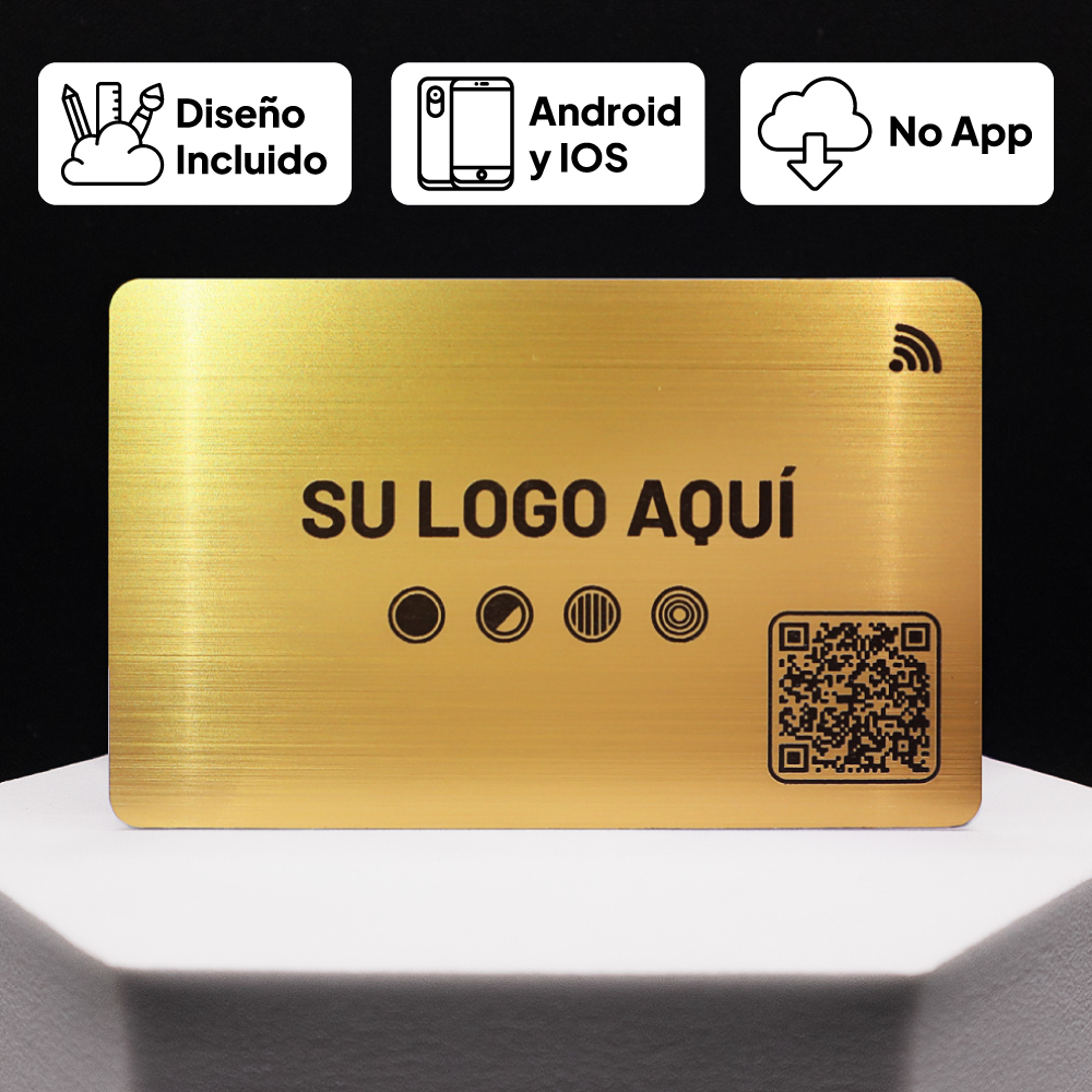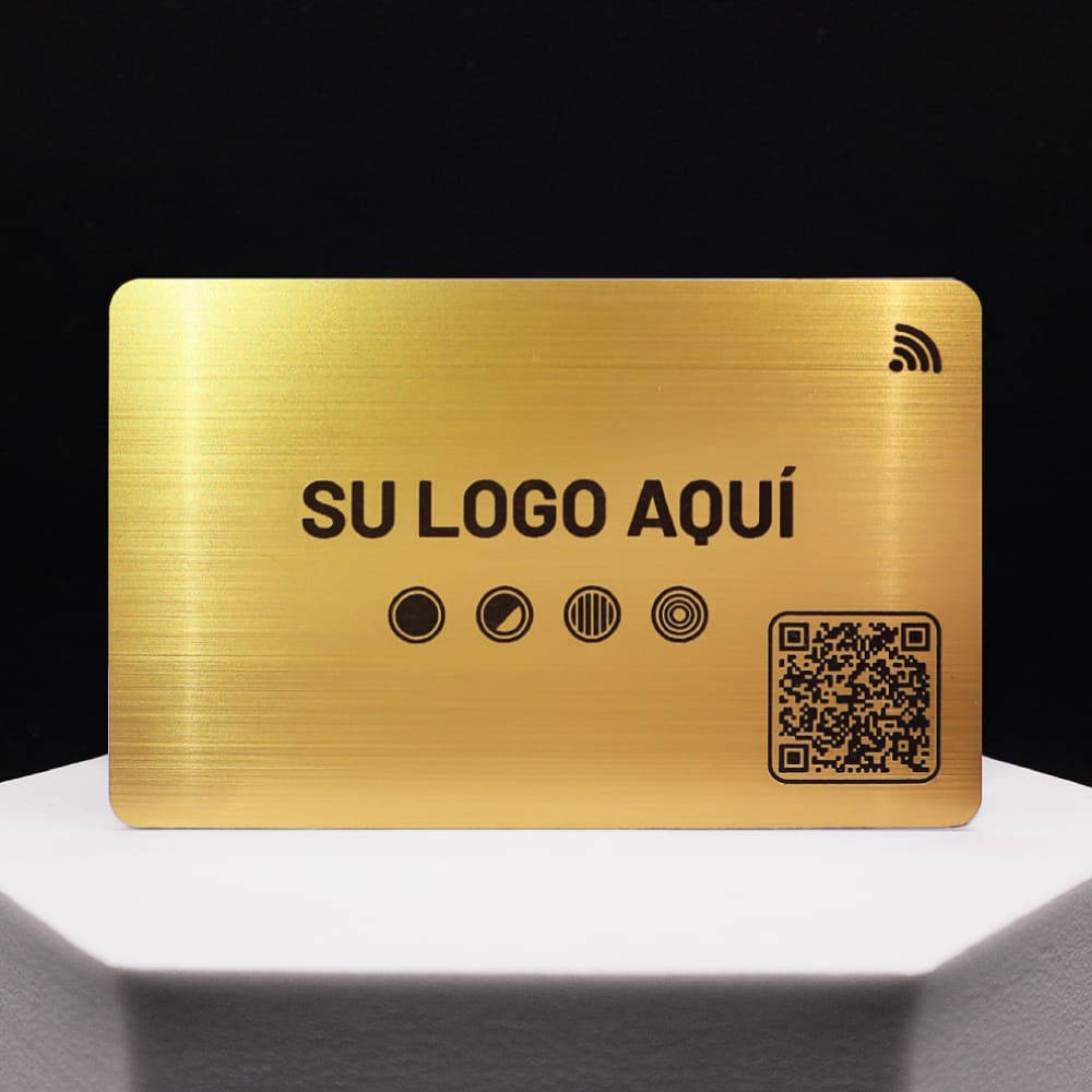 Tarjeta de presentación digital en metal dorado con NFC y QR. Personalízala y comparte tu información con estilo al instante y sin apps.