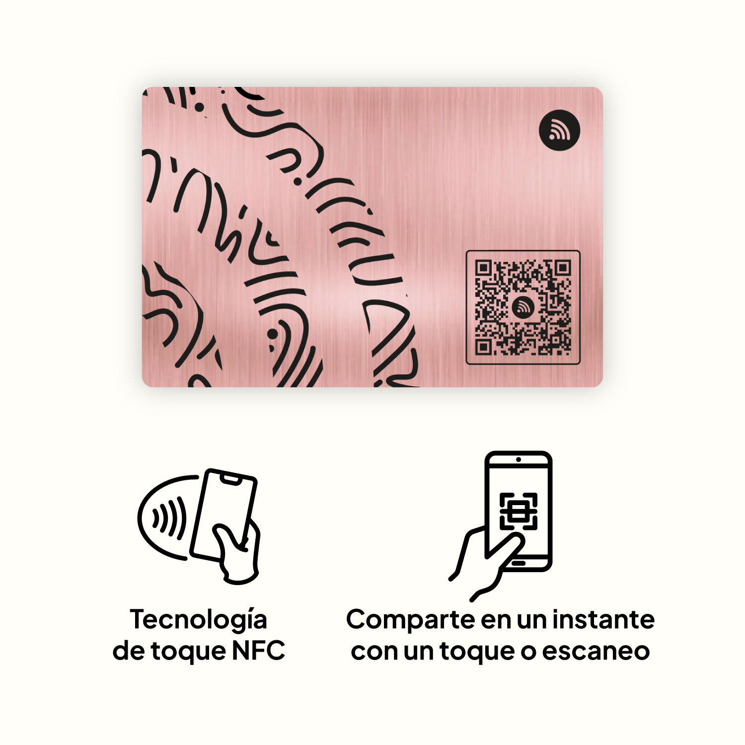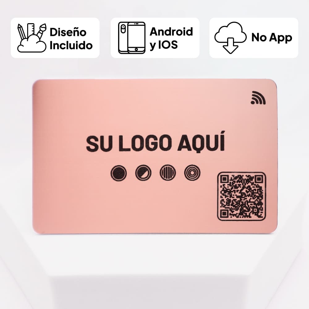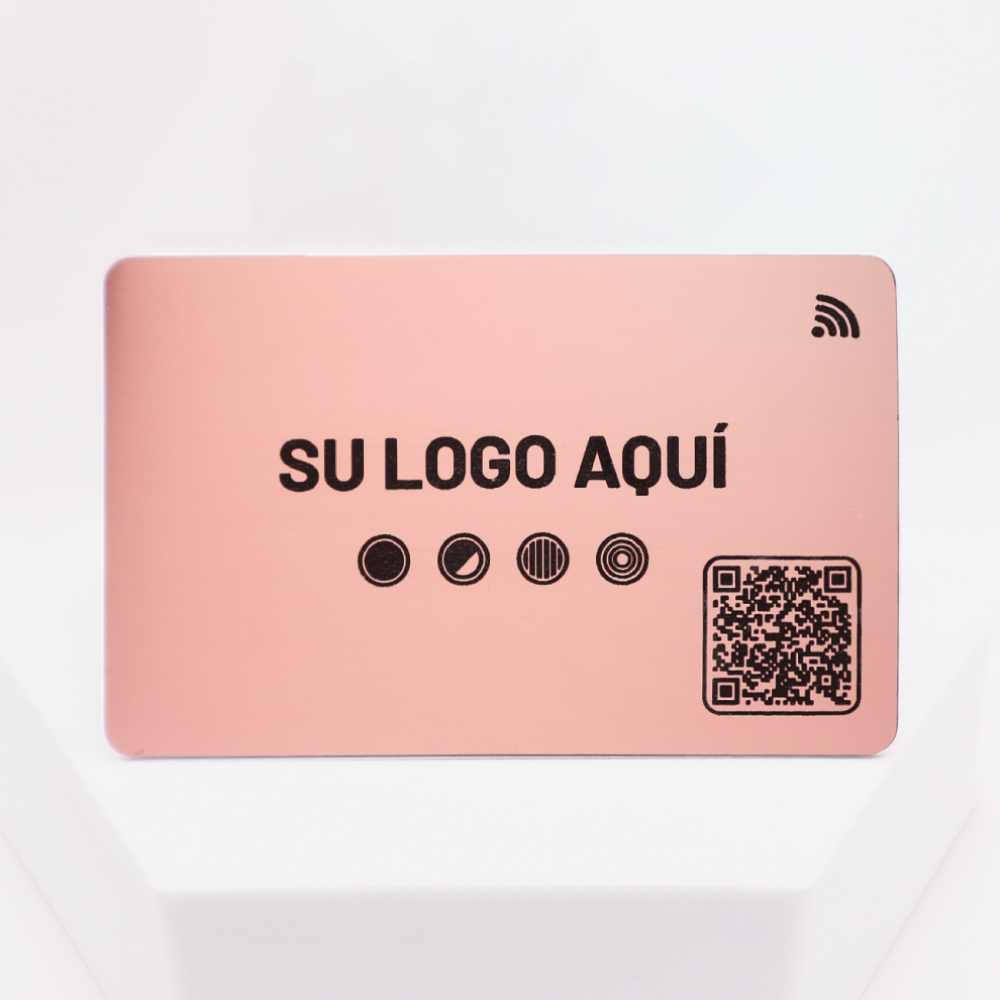 Tarjeta de presentación digital en metal oro rosa con NFC y QR. Personalízala y comparte tu información con estilo y sin apps.